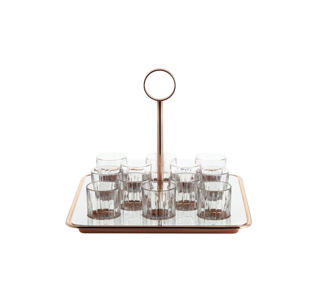 Bu zarif ve modern likör seti 12 bardaktan oluşmaktadır. Gümüş yüzey ve bakır yapı, bu seti şık ve modaya uygun gerçek bir dekor unsuru haline getiriyor.