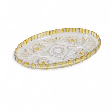 30x18 cm ölçülerindeki bu zarif oval kristal servis tabağı, 1940’lı yıllarda Almanya’da üretilmiştir. El işçiliğiyle kesilmiş kristal detaylar, ışığı zarif bir şekilde yansıtarak masanıza sofistike bir hava katar. Oval formu, hem kullanım kolaylığı hem de estetik duruş açısından avantaj sağlar. Tatlı, meyve ya da çerez sunumları için ideal olan bu parça, dönemine ait orijinal tasarımıyla dikkat çeker. Kristal koleksiyonları ve vintage dekorasyonu sevenler için oldukça değerli olan bu servis tabağı, hem fonksiyonel hem dekoratif bir kullanım sunar.