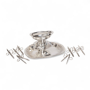 Christofle imzalı bu şık set, sofistike detayları ve işlevselliğiyle öne çıkar. 35x28 cm ölçülerindeki oval servis kabı, üzerindeki kuşkonmaz desenleriyle klasik Fransız mutfak estetiğine gönderme yaparken; yanında gelen 6 adet kuşkonmaz tutacağı ile set tamamlanır. Tümü gümüş kaplama olan parçalar, parlak yüzeyleriyle masada zarafet yaratır. Sosluk bölmesi, sunumu pratikleştirirken estetik görünümünden ödün vermez. İkram ve servis anlarında kullanabileceğiniz bu özel takım, hem günlük şıklık hem de özel davetler için mükemmeldir. Christofle kalitesiyle üretilmiş olan set, koleksiyonluk değere sahiptir ve sofralarınıza Fransız inceliği taşır.