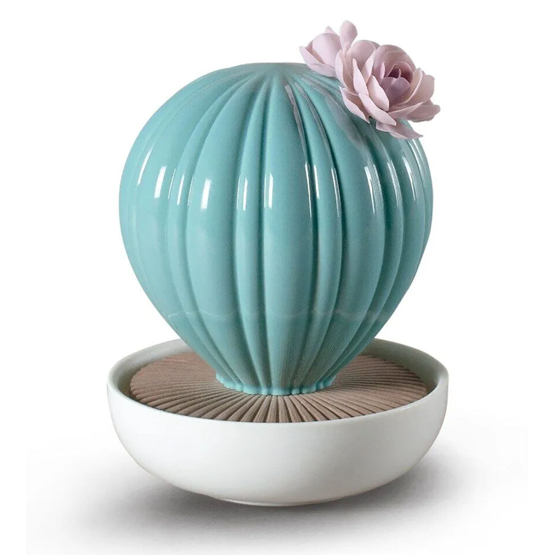Çiçekli Ferocactus'un parlak porselen formundaki bu ev kokusu, Valencia Bahçeleri esansiyel yağını dökebileceğiniz emici seramik tabanıyla benzersiz bir tasarıma sahiptir. Kaktüslerin büyüleyici güzelliğini ve dikenlerinin gücünü zarif çiçeklerle birleştiren bu sıvı aroma difüzör koleksiyonu, tamamen el yapımı porselenden üretilmiştir. Sadece tabanlarına dökülen koku ile evinizi en harika esanslarla dolduran bu difüzör, Kaktüs'ün zarif kıvrımlarına adanmış bir övgüdür. Bu difüzöre eşlik eden Valencia Bahçeleri kokusu, bergamot, sümbülteber ve vanilya esanslarıyla zenginleştirilmiş meyveli bir parfümdür. 200 ml esansiyel yağ içeren bu özel koku, 2 aydan fazla süren kalıcılığı ile etkileyici bir atmosfer yaratır. Formülünde %29'a kadar parfüm bulunur, böylece kokunun yoğunluğu ve kalıcılığı en üst düzeye çıkarılır.