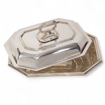 Gümüş kaplama yüzeyi, yılların izini zarafetle taşırken; orijinal damgası, Mappin & Webb’in yüzyılı aşan ustalığını belgeliyor. Sahanın klasik formu ve detaylı kapağı, hem servis sunumlarında kullanılabilir hem de vitrinlerde zarif bir dekoratif obje olarak değerlendirilebilir.