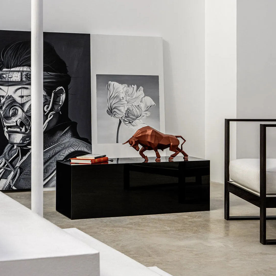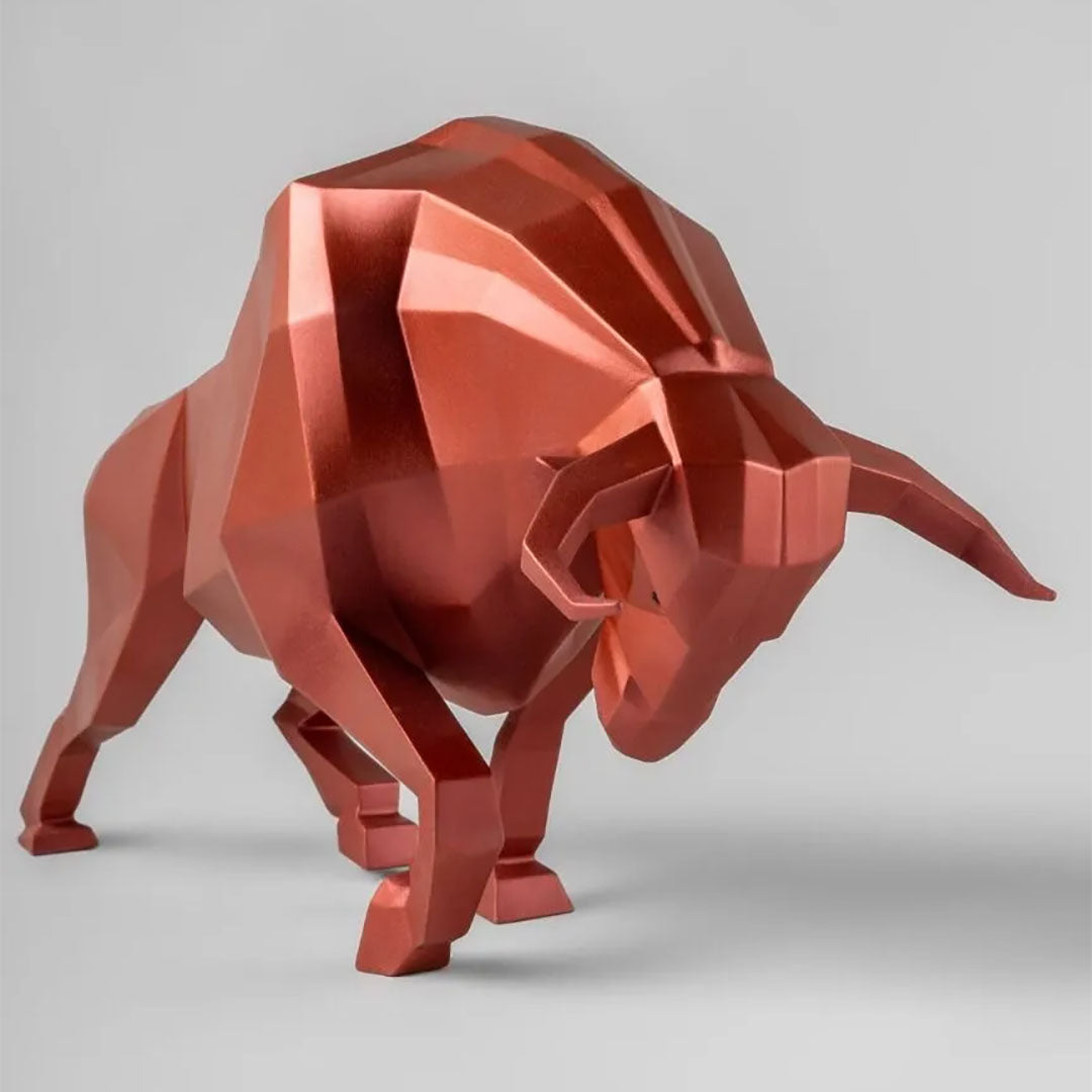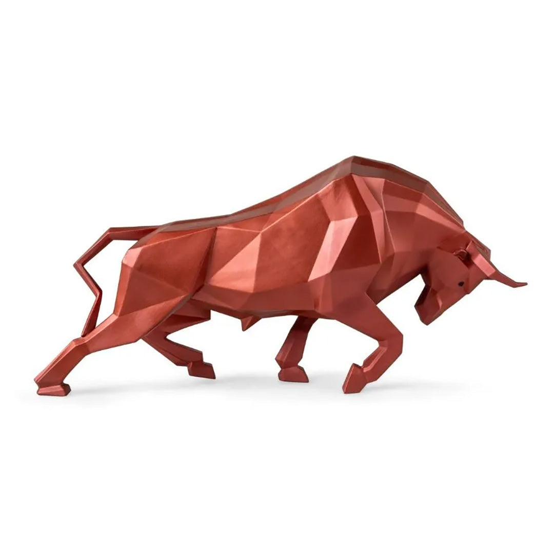 Kırmızı renkte, metalik efektli mat porselenden yapılmış bu heykel, dövüşen bir boğanın gücünden ve cesaretinden ilham alıyor. Boğanın hücum etmeye hazırlanırken tipik pozunu tasvir eden eşsiz bir eser. Hayvanlar aleminin geometrik ve kavramsal bir vizyonunu sunan Origami koleksiyonunun bir parçası. Bu boğa heykeli, hayvanın gözlerinde bir renk dokunuşuyla metalik kırmızı porselenden el işçiliğiyle yapılmıştır.