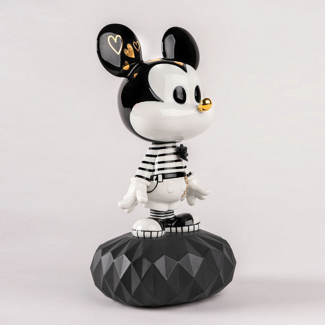 Disney'in en sevilen karakterlerinden biri olan Mickey Mouse'un çağdaş bir versiyonunu tasvir eden porselen heykel. Bu eser Mickey Mouse'un çağdaş bir vizyonuna dayanmaktadır. Yaratıcı yaklaşım animasyon tekniklerine ve siyah beyaz mürekkeple fırça darbelerine dayanmaktadır. Burada Mickey, Lladró'nun imgelemindeki en seçkin temalardan bazılarını temsil eden porselen üzerine elle boyanmış çizimlerle süslenmiştir; aşk, doğa ve büyü gibi. Çizimler ayrıca tişörtünün dekorasyonunda, ünlü eldivenlerinde, çoraplarında ve ayakkabılarında da yer almaktadır; hepsi büyük bir hassasiyetle ve aynı anda neşeli ve büyüleyici bir şekilde yapılmıştır. Siyah beyaz dekorasyon, burnundaki altın parıltının birkaç iyi seçilmiş dokunuşuyla veya belinden sarkan anahtarlarla, Mickey'nin kalpleri açmak için kullandığı anahtarlarla dengelenmiştir. Çünkü iyilik ve sevgiden bahsedebilen bir karakter varsa, o da Mickey Mouse'dur.