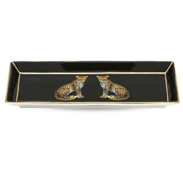 Magnificent Wildlife koleksiyonunun dikkat çekici parçalarından biri olan Çift Leopar Desenli Dikdörtgen Tepsi, zarif İngiliz porselen ustalığını güçlü hayvan figürleriyle buluşturur. Siyah ince kemik çini yüzey üzerinde yer alan el boyaması ikiz leopar figürleri, tasarıma etkileyici bir karakter kazandırır.