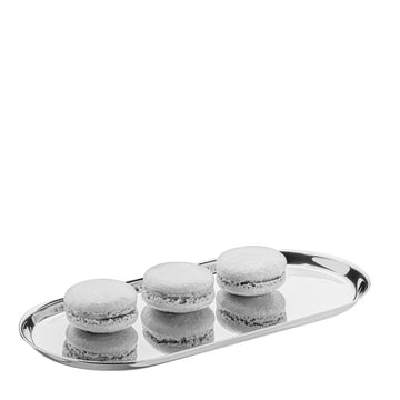 Oval Servis Tepsisi, klasik formu ve parlak gümüş kaplama yüzeyiyle zamansız bir servis deneyimi sunar. Oval tasarımı, sunumlara yumuşak ve akışkan bir estetik kazandırırken farklı ikram türleri için esnek kullanım sağlar. Kahve, çay, tatlı ve atıştırmalık sunumlarında zarif bir tamamlayıcıdır.