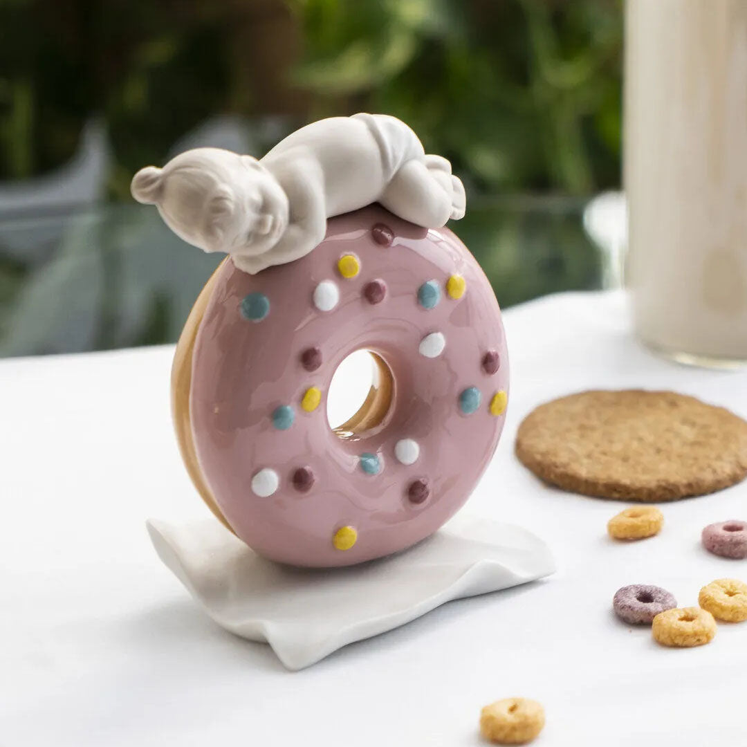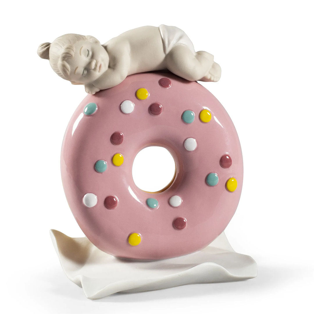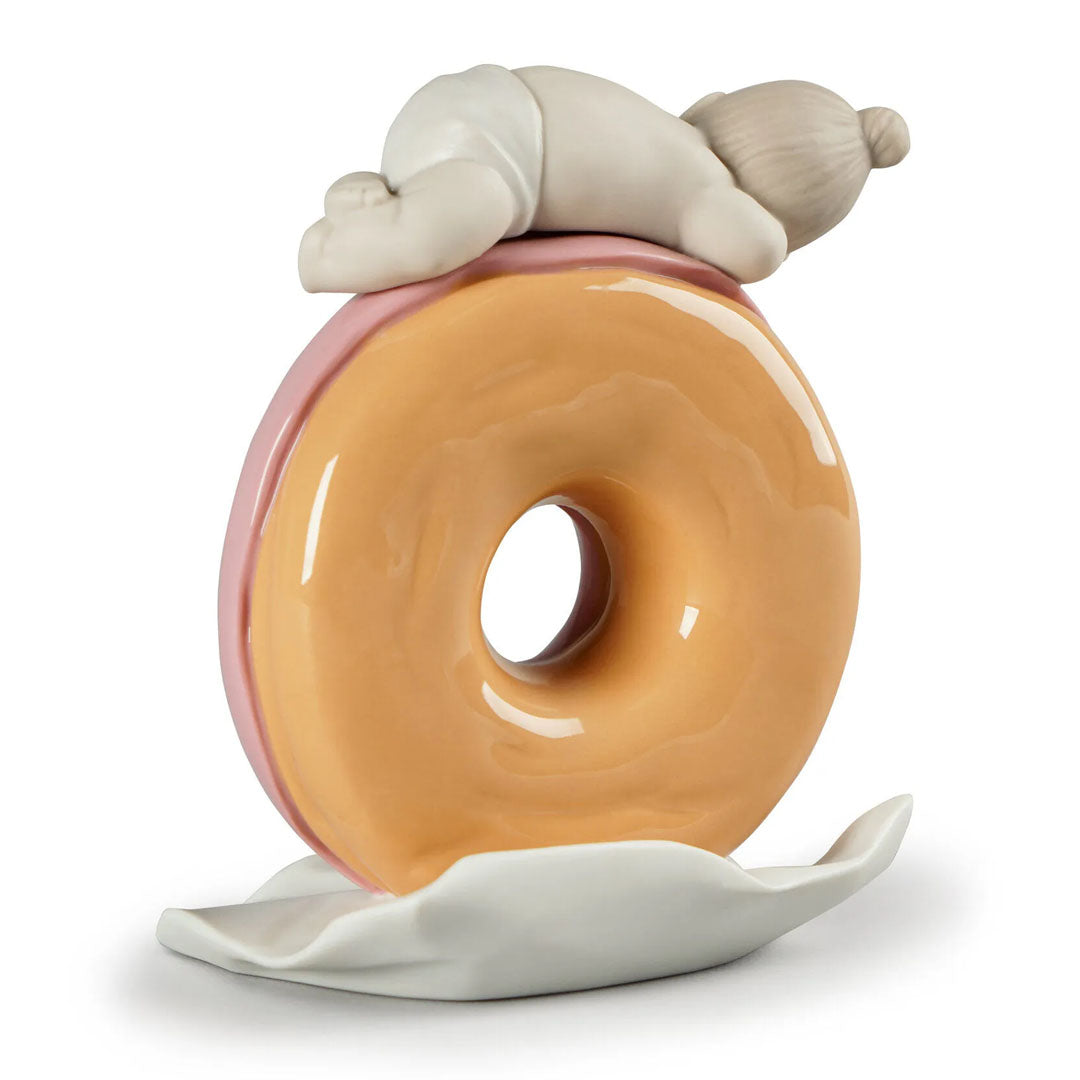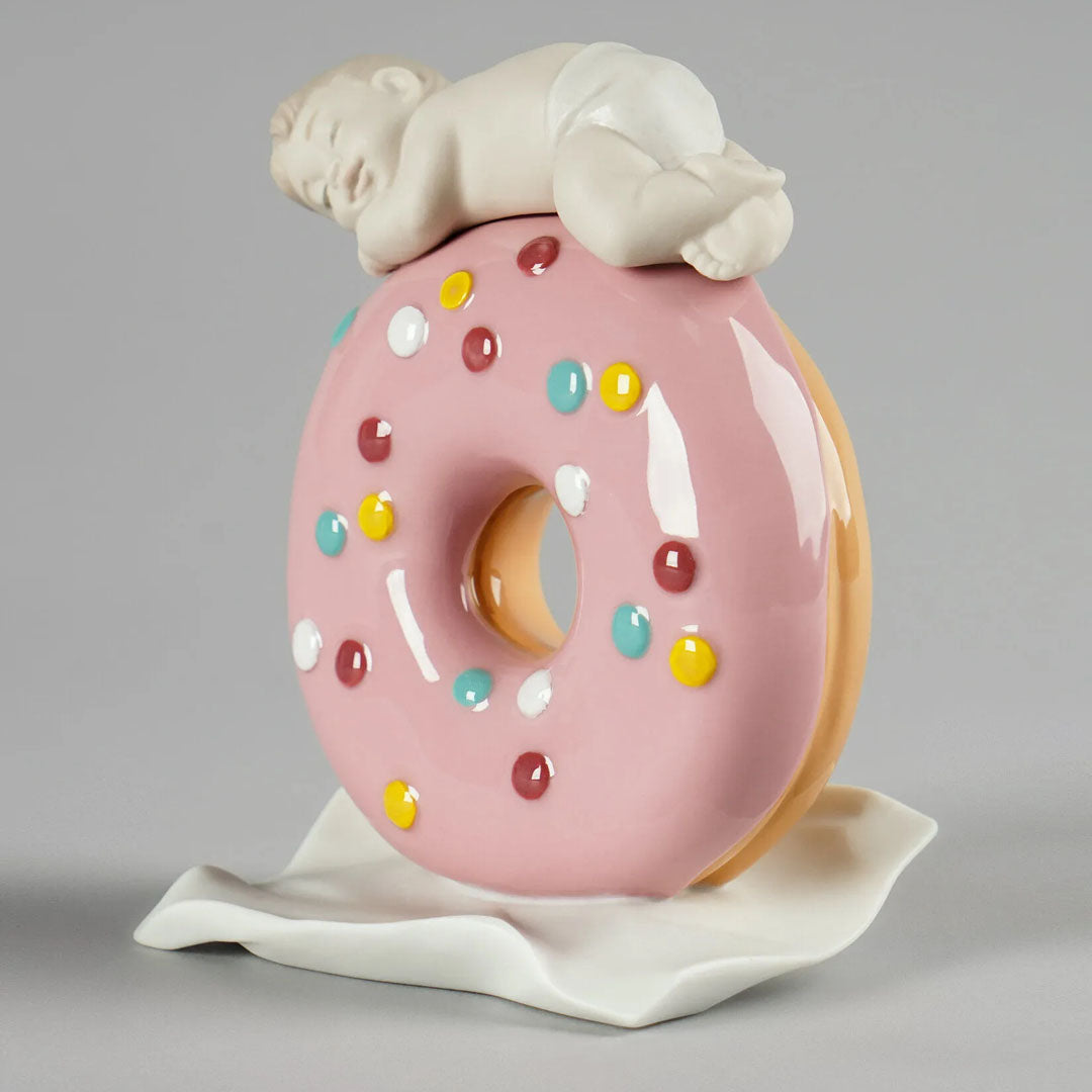 Tipik bir çöreğin üzerinde uyuyan sevimli küçük bir kız bebeğin yer aldığı porselen biblo bebek. Sırlı ve mat porselenin karıştırıldığı, elle titizlikle uygulanan pastel tonlarla dekore edilmiş bir parça. Şefkati mizahla birleştiren, tabanda bu amaç için mevcut alanda kişiselleştirilebildiği için yeni doğmuş bir bebek için ideal bir hediye haline gelen bir yaratım.