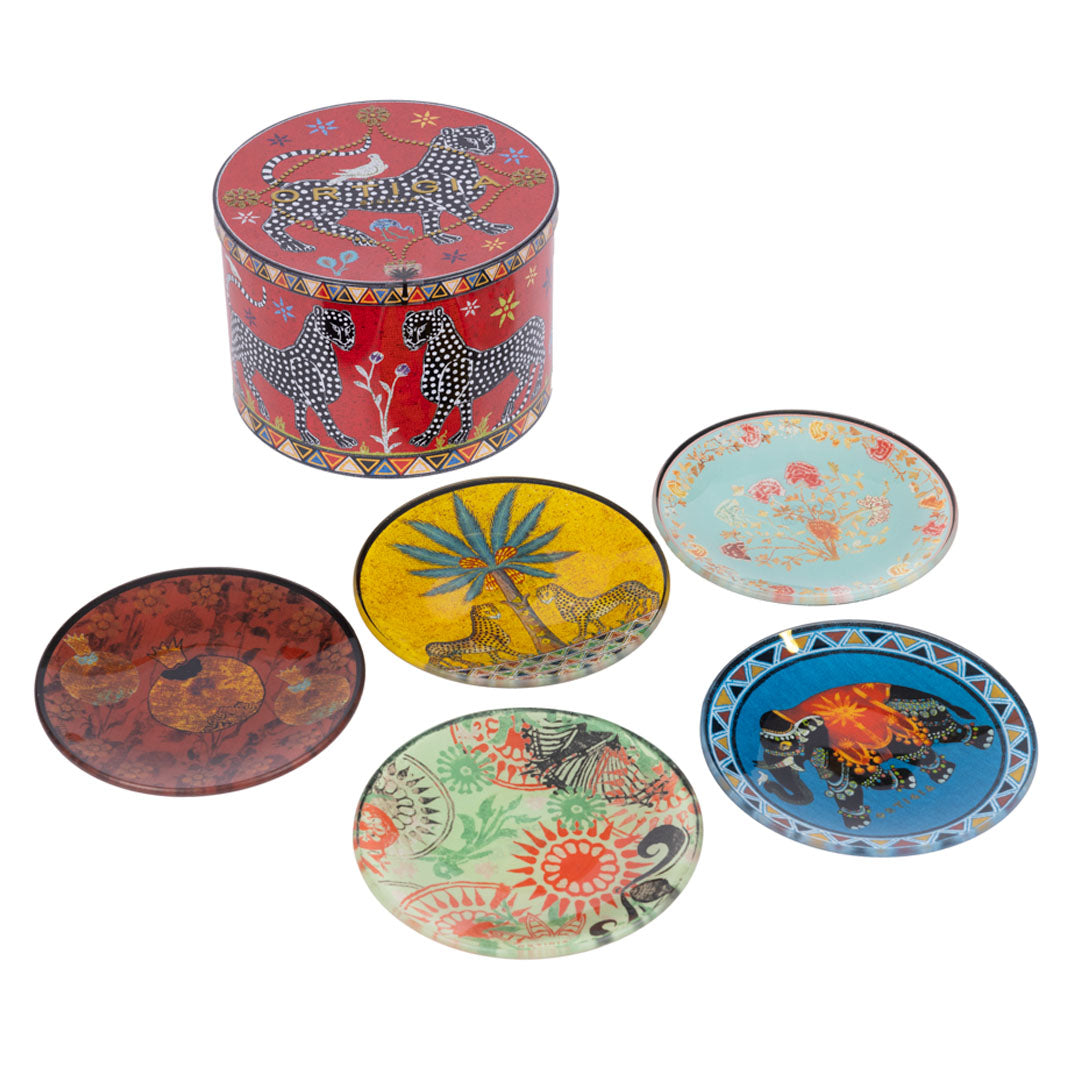 Akşam yemeği partilerinizin vazgeçilmezi olacak bu 5'li Yuvarlak Ortigia Bardak Altlığı koleksiyonu, Ortigia'nın ikonik Fico, Florio, Melograno, Sandalo ve Zagara tasarımlarının serigrafi baskılarıyla süslenmiştir.